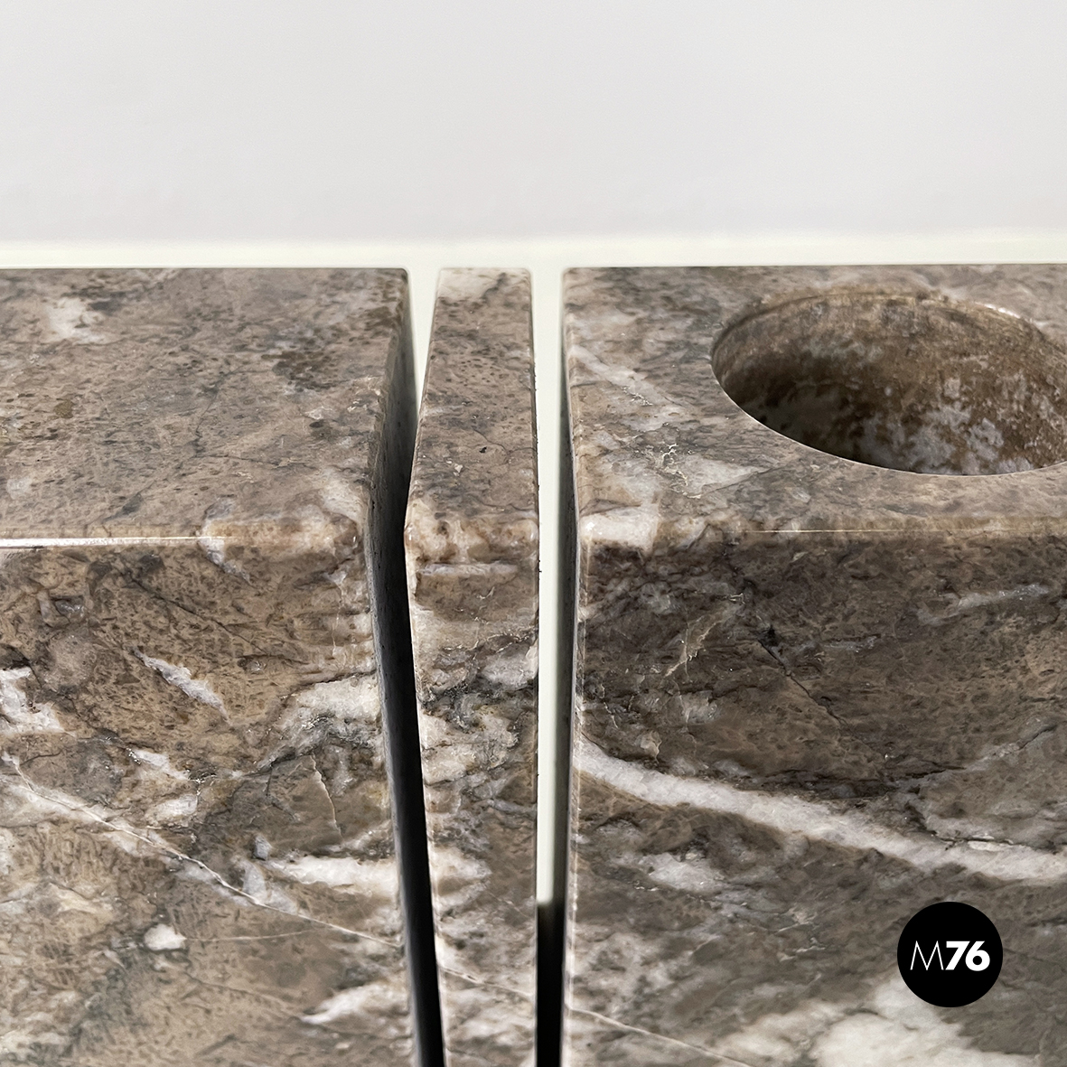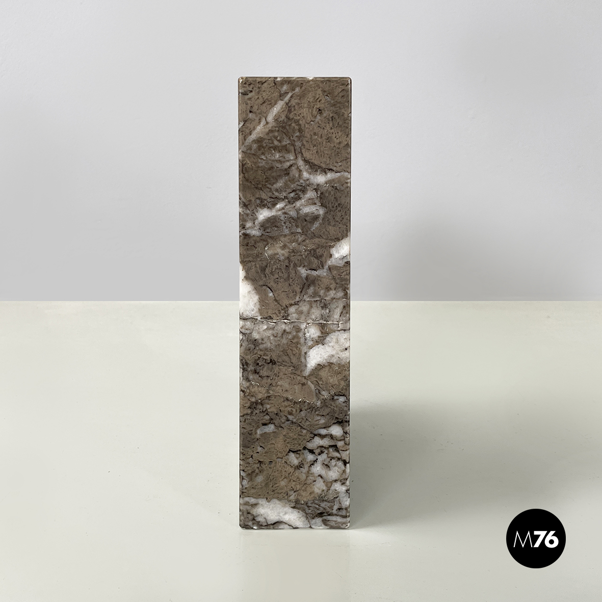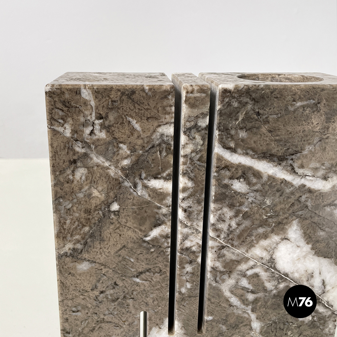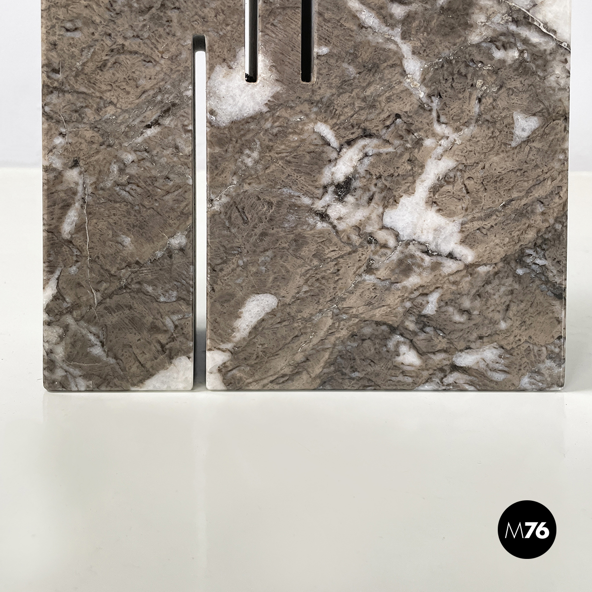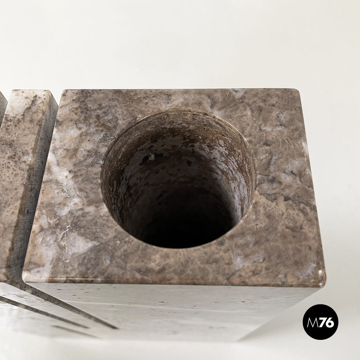 Vaso scultoreo a base rettangolare, interamente in marmo grigio. Su uno dei due lati corti presenta un foro tondo e due scanalature decorative, mentre sul lato opposto un foro e una scanalatura decorativa. Utilizzabile come scultura o oggetto di arredamento.