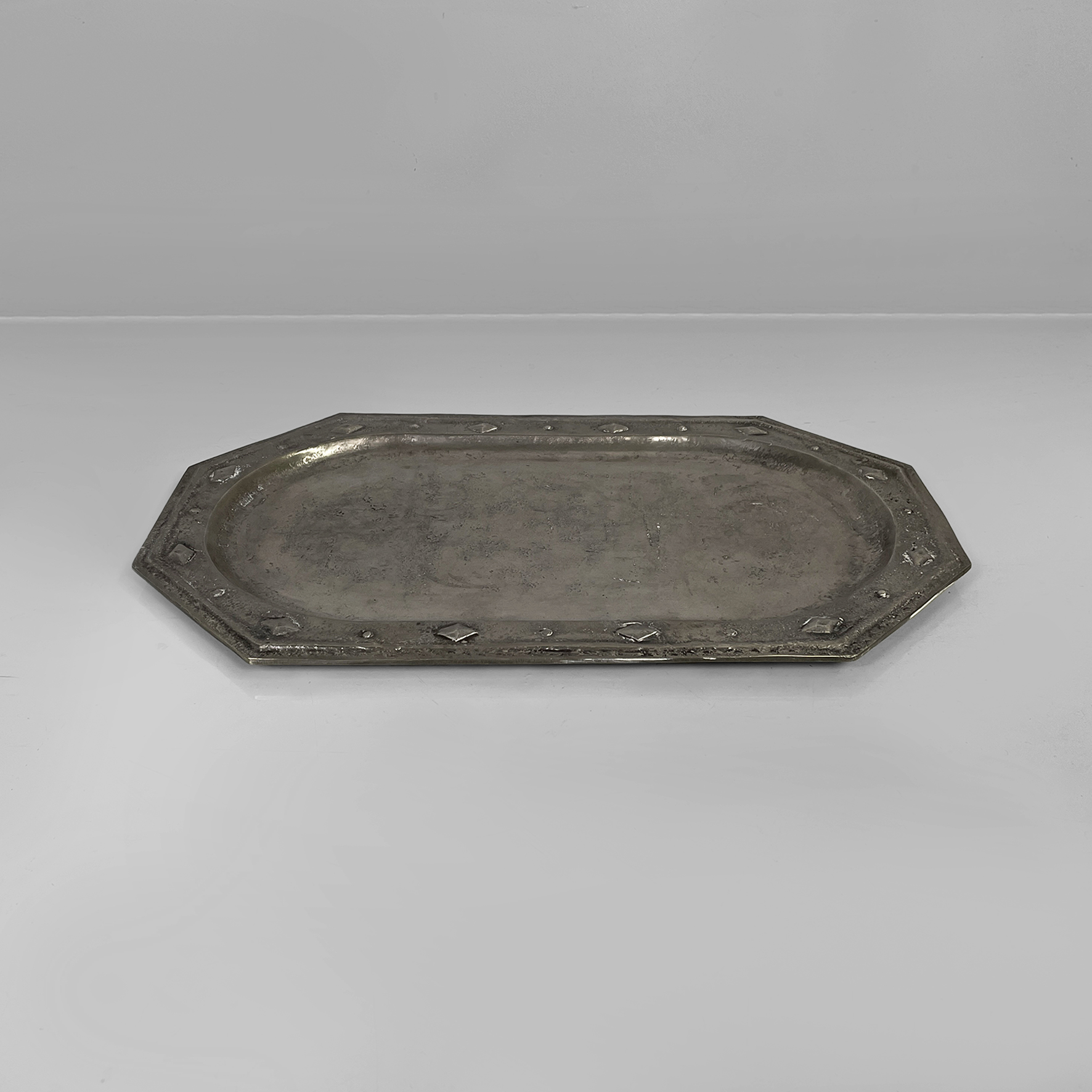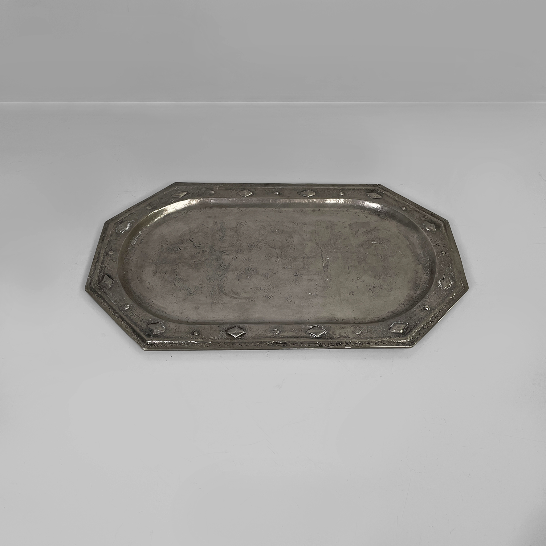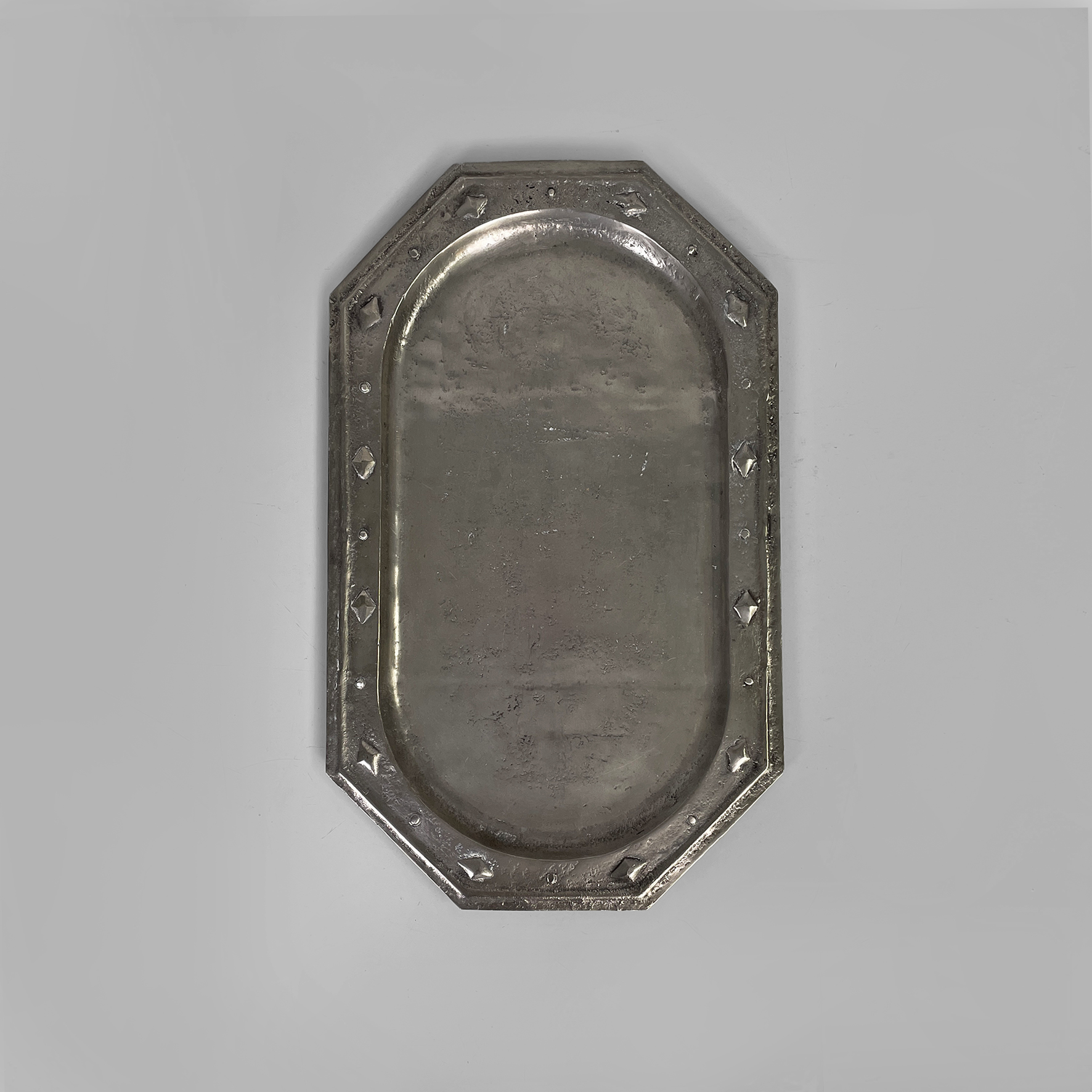 Vassoio con ripiano di forma ovale allungata racchiusa in un contorno ottagonale. ll bordo è arricchito da elementi decorativi in rilievo di forme geometriche come rombi e cerchi.