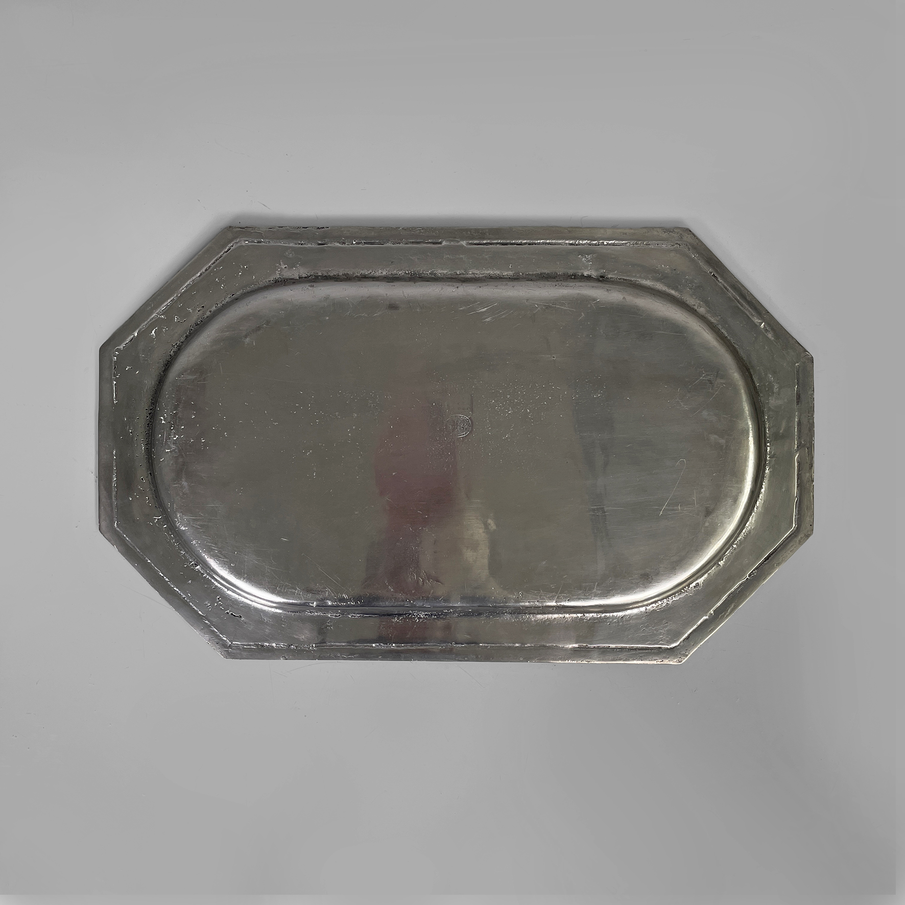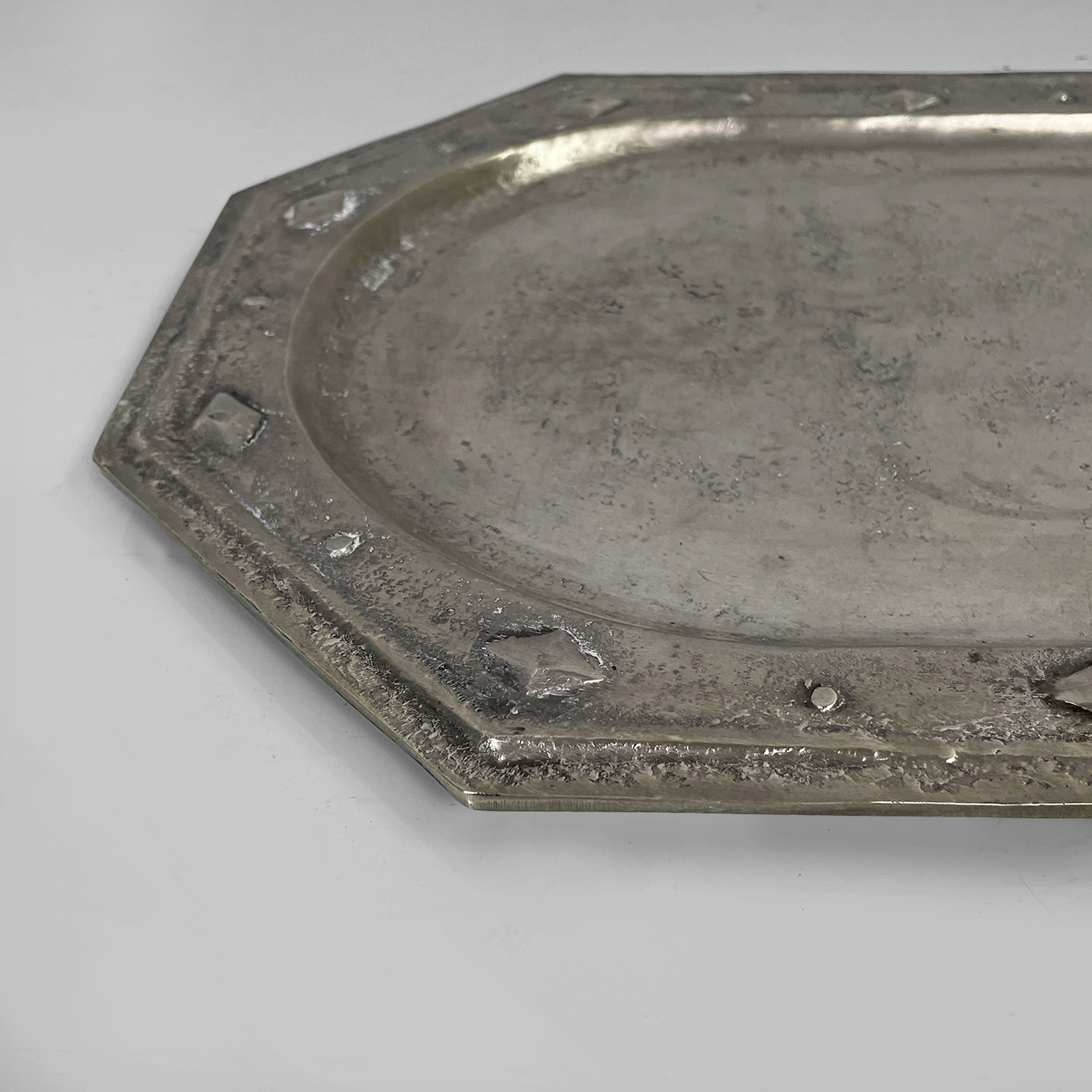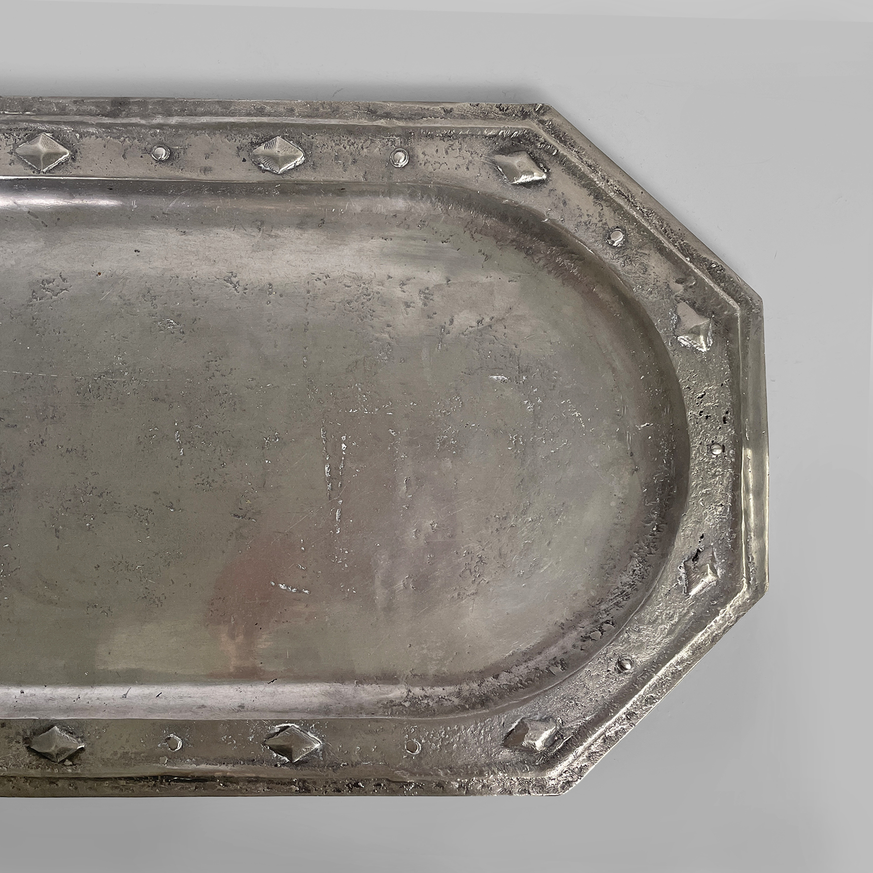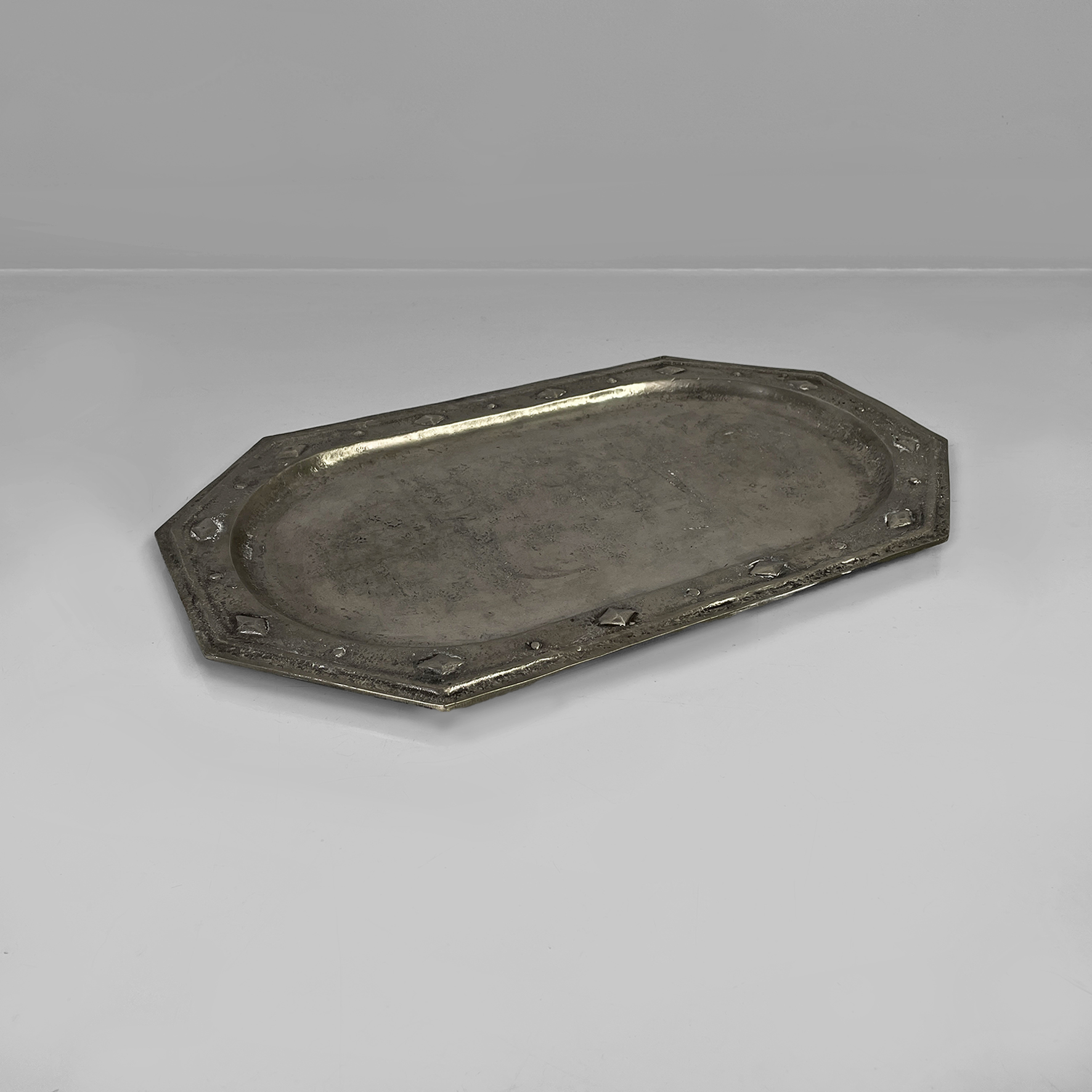 Vassoio con ripiano di forma ovale allungata racchiusa in un contorno ottagonale. ll bordo è arricchito da elementi decorativi in rilievo di forme geometriche come rombi e cerchi.