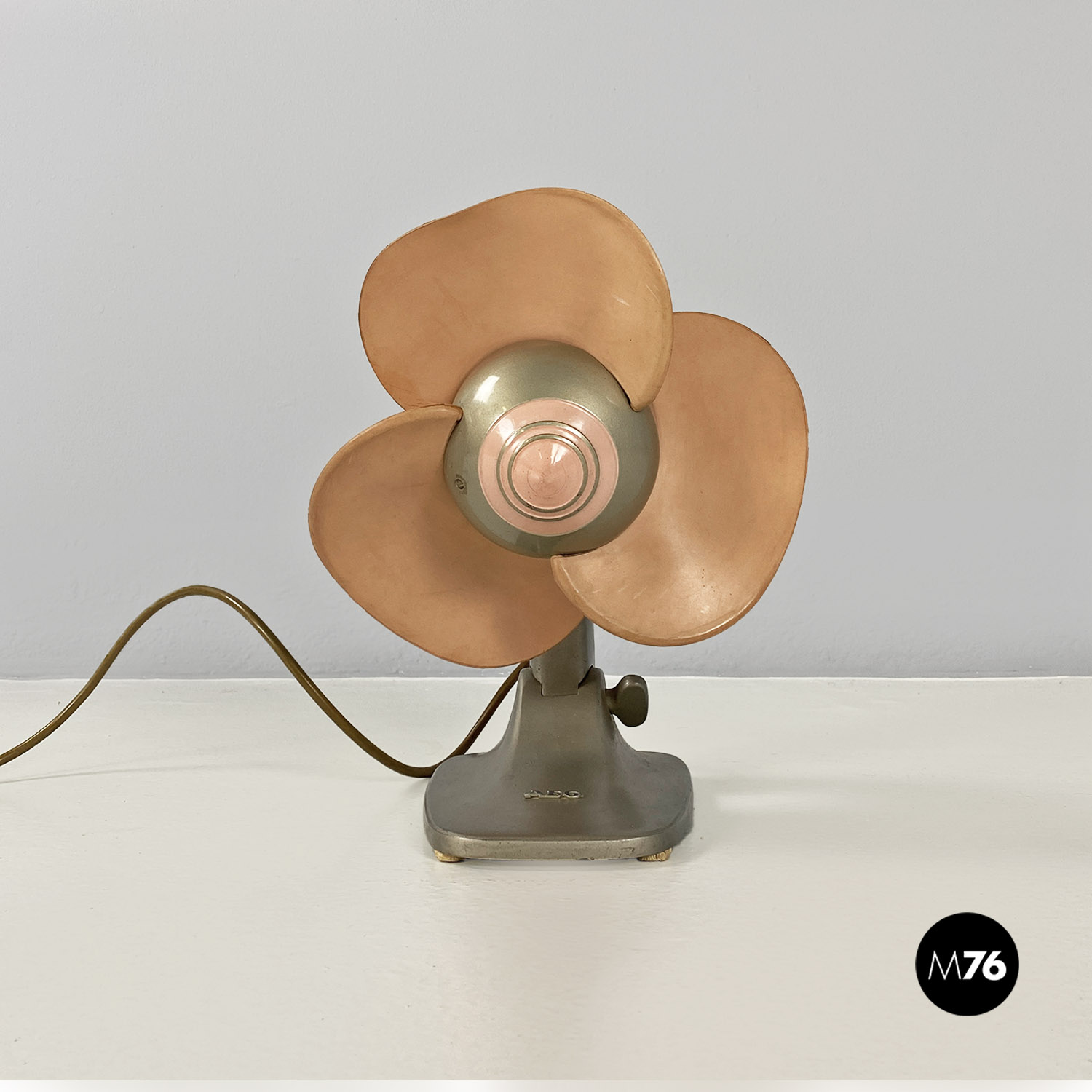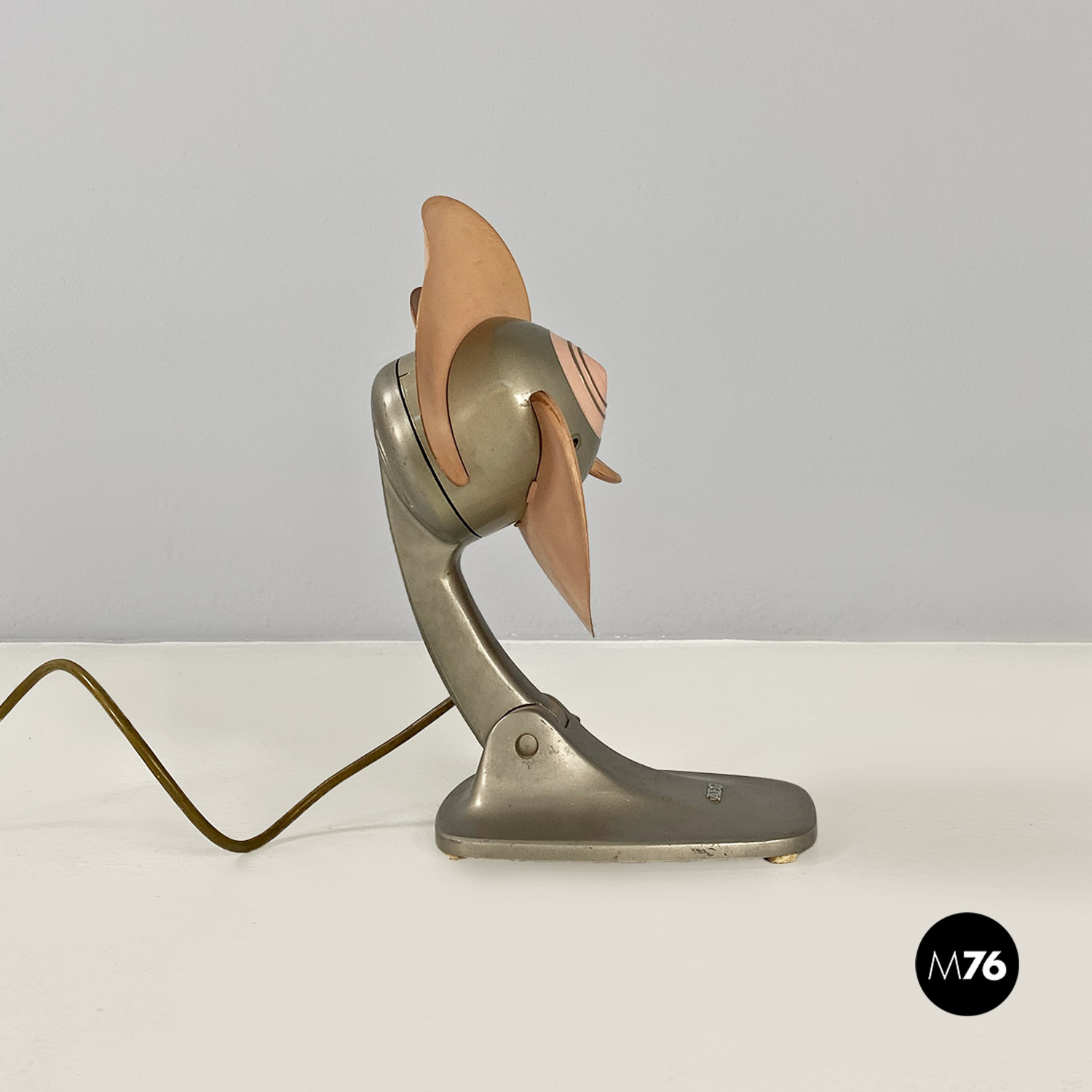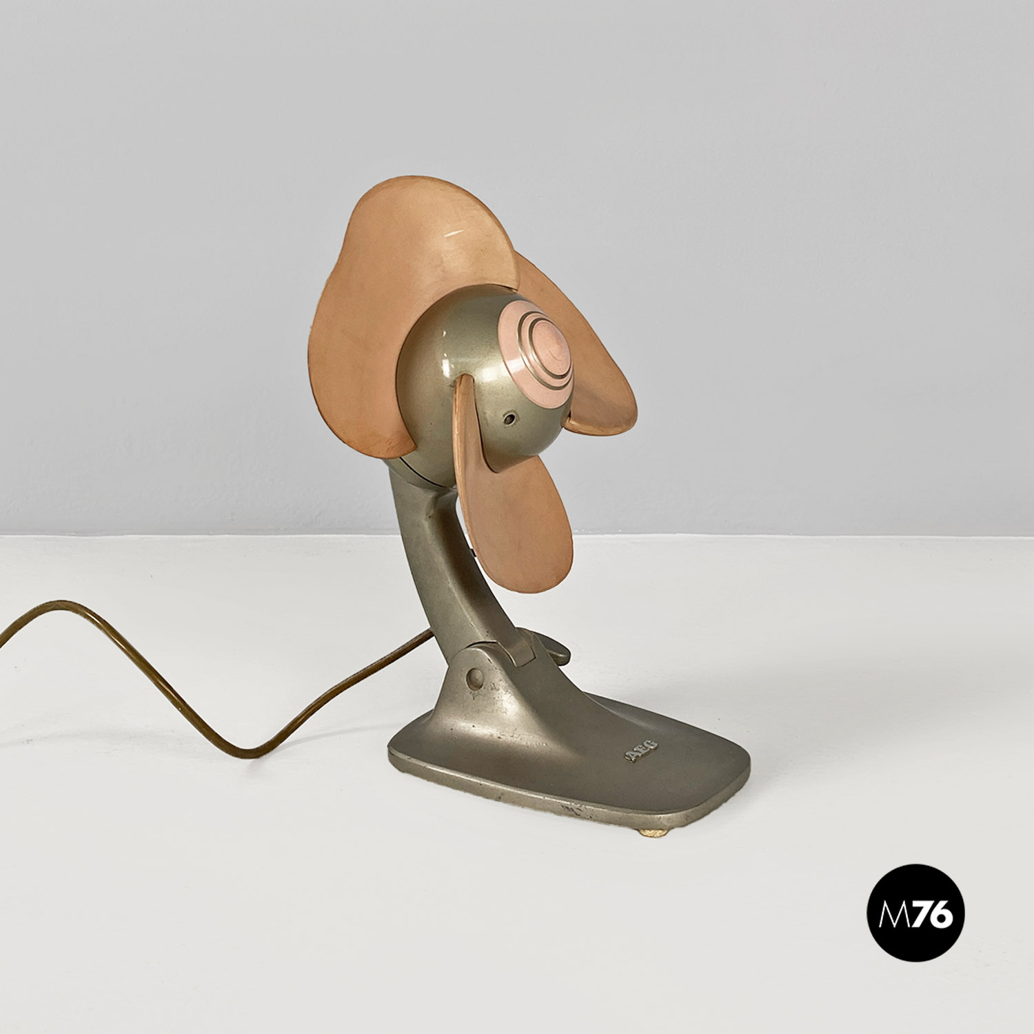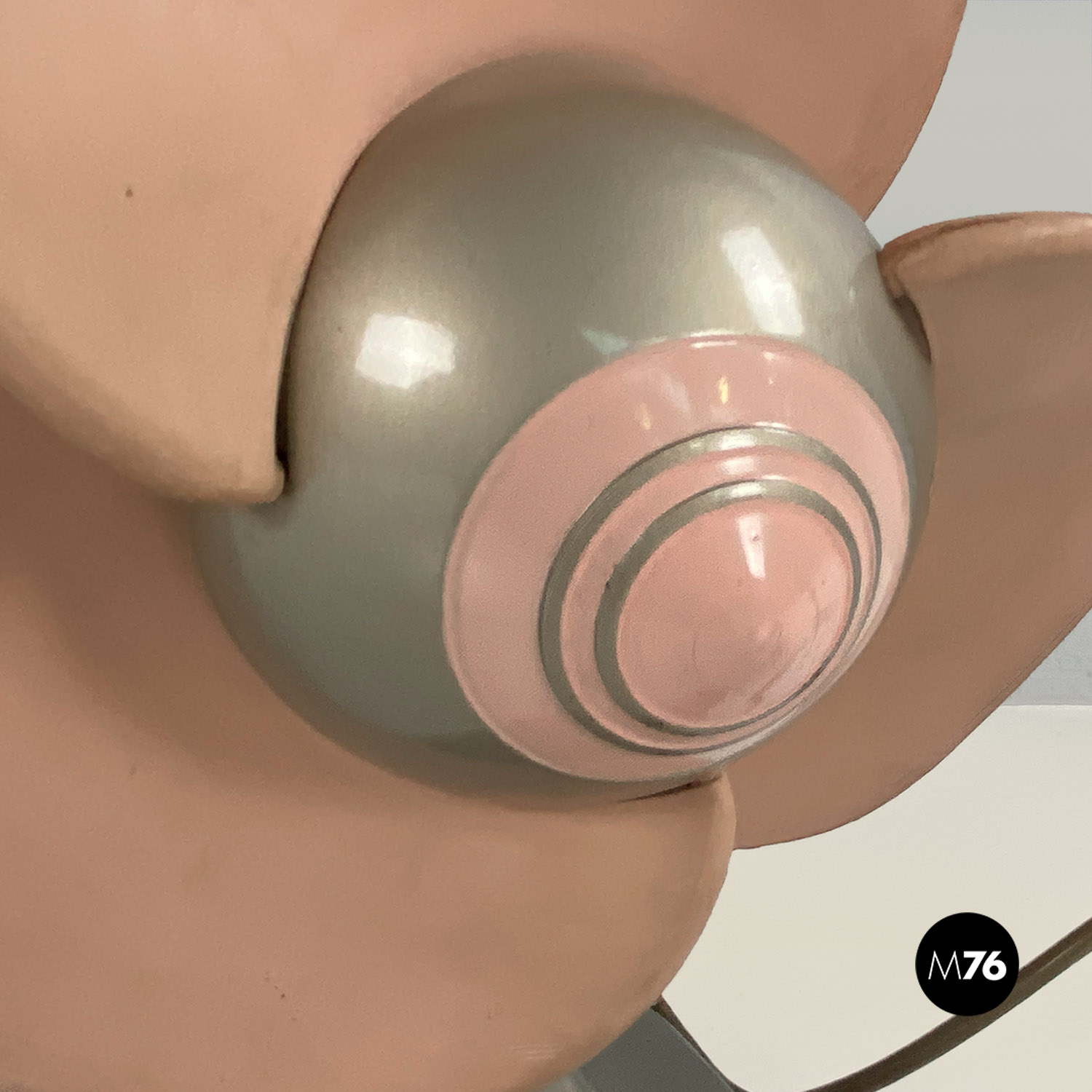 Apparecchio per ventilazione domestica o da ufficio, da tavolo, con pale in gomma rosa e base in metallo.