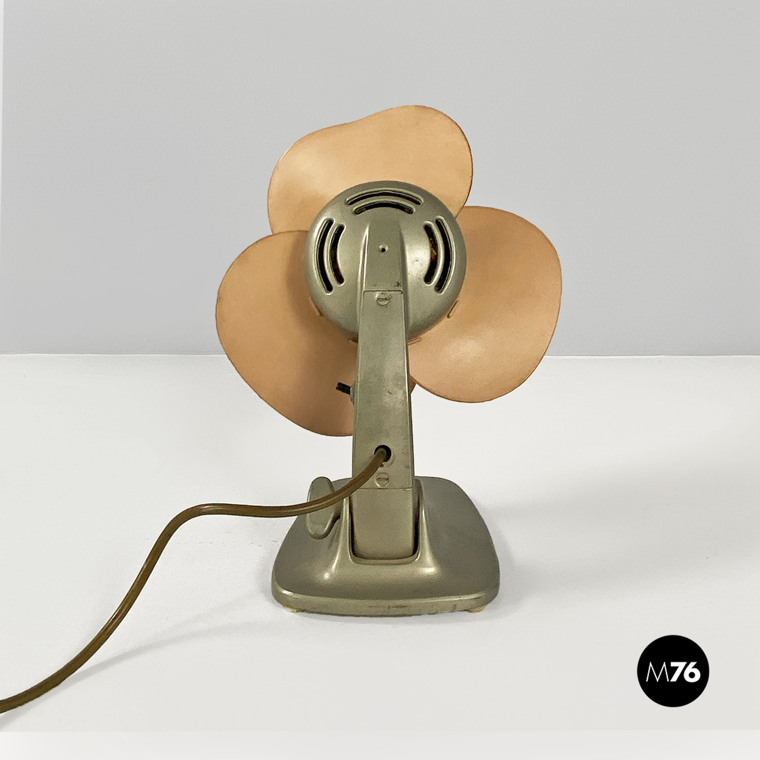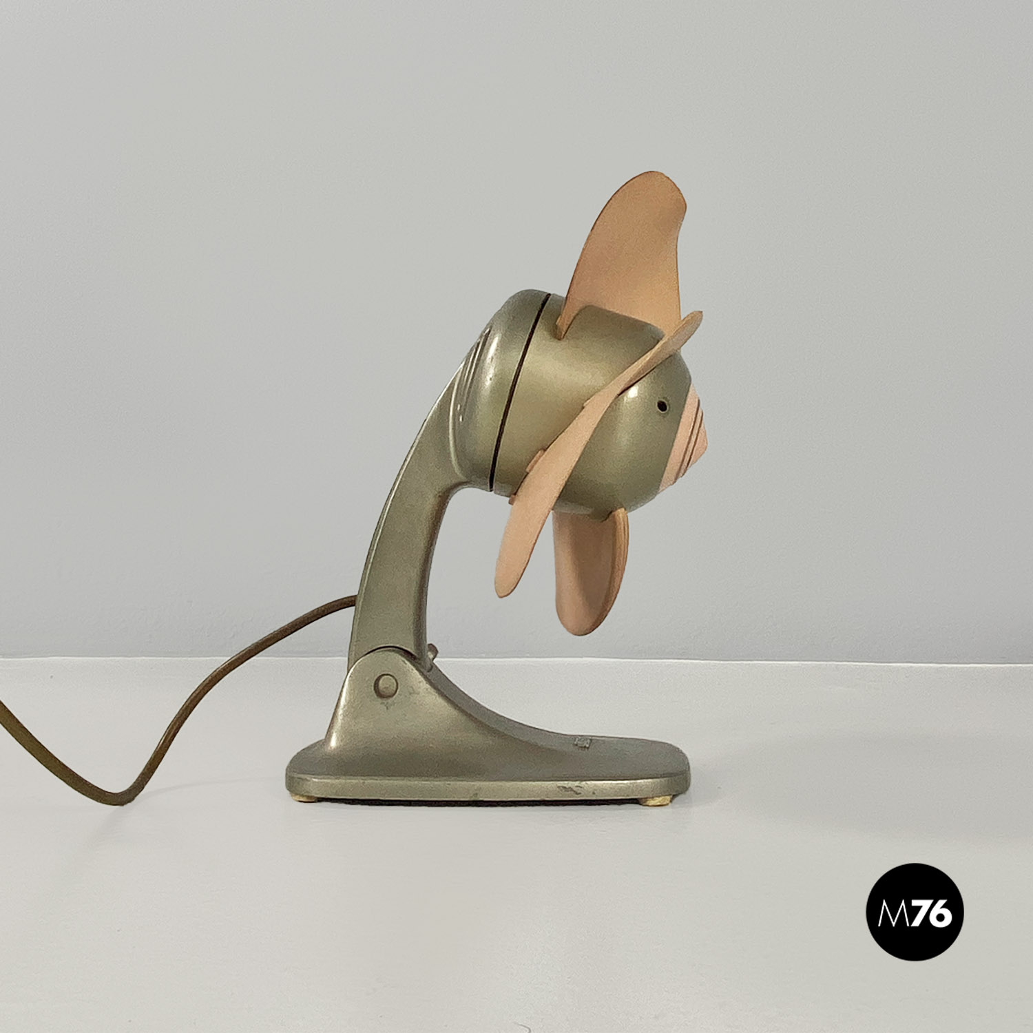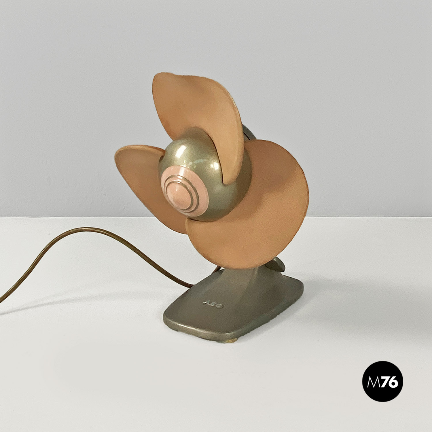 Apparecchio per ventilazione domestica o da ufficio, da tavolo, con pale in gomma rosa e base in metallo.