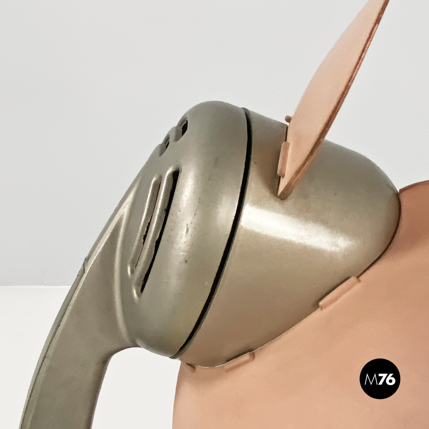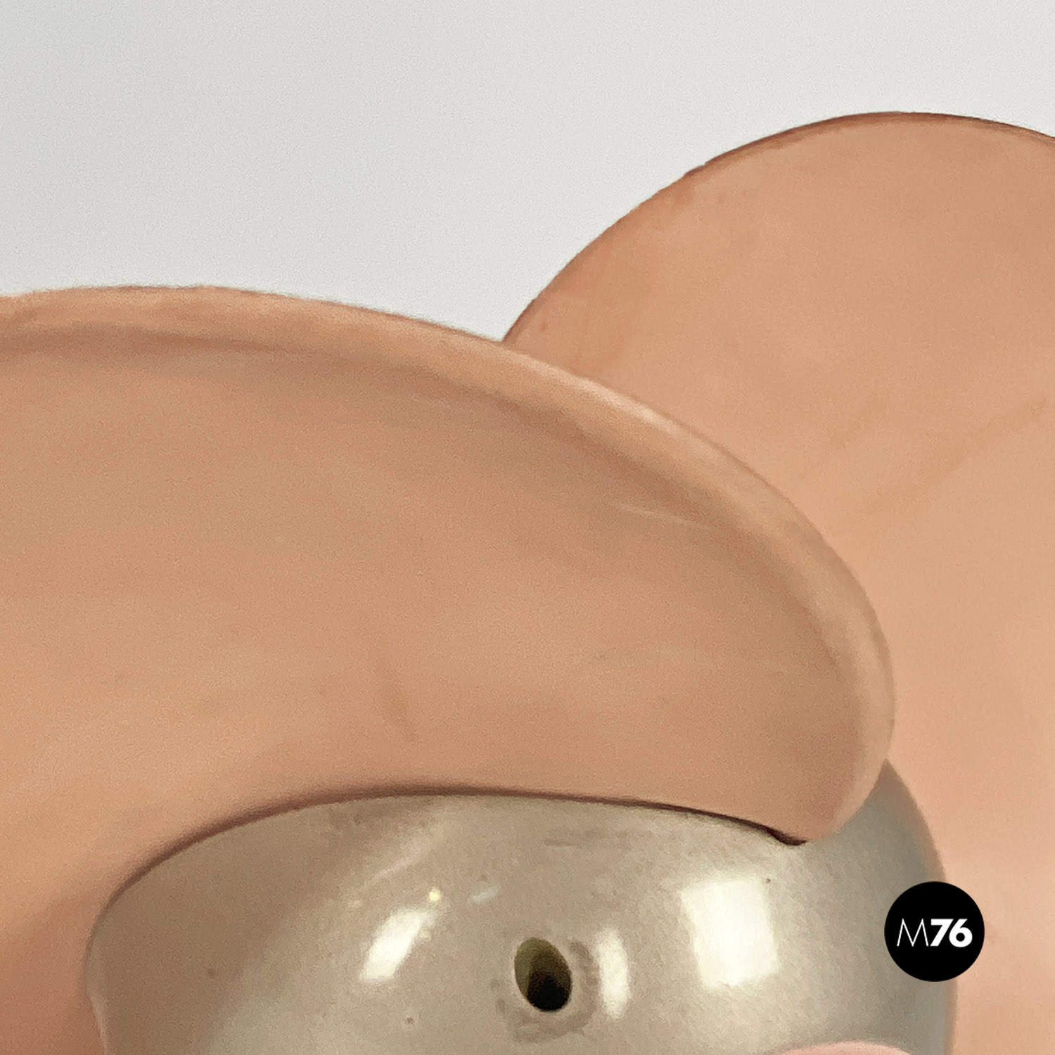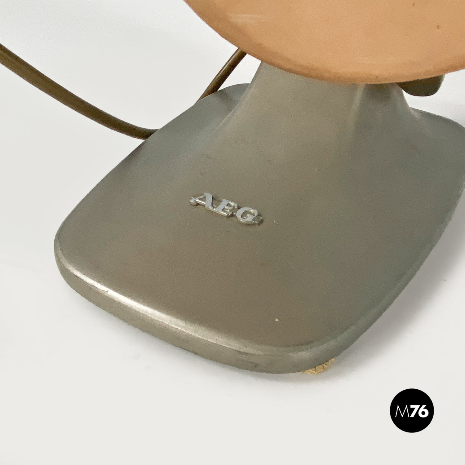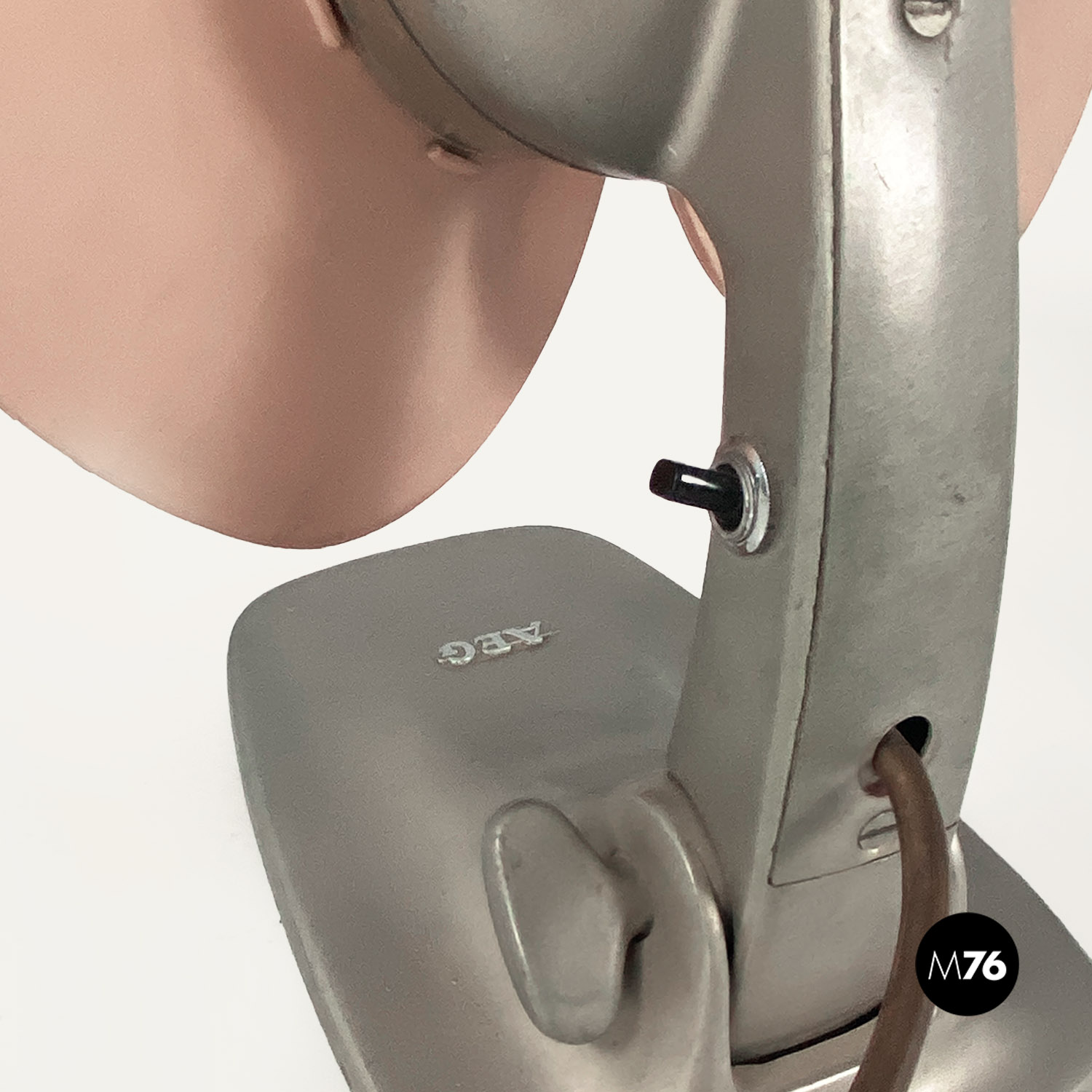 Apparecchio per ventilazione domestica o da ufficio, da tavolo, con pale in gomma rosa e base in metallo.