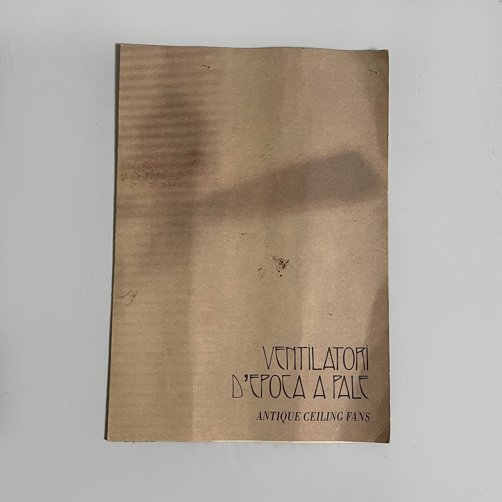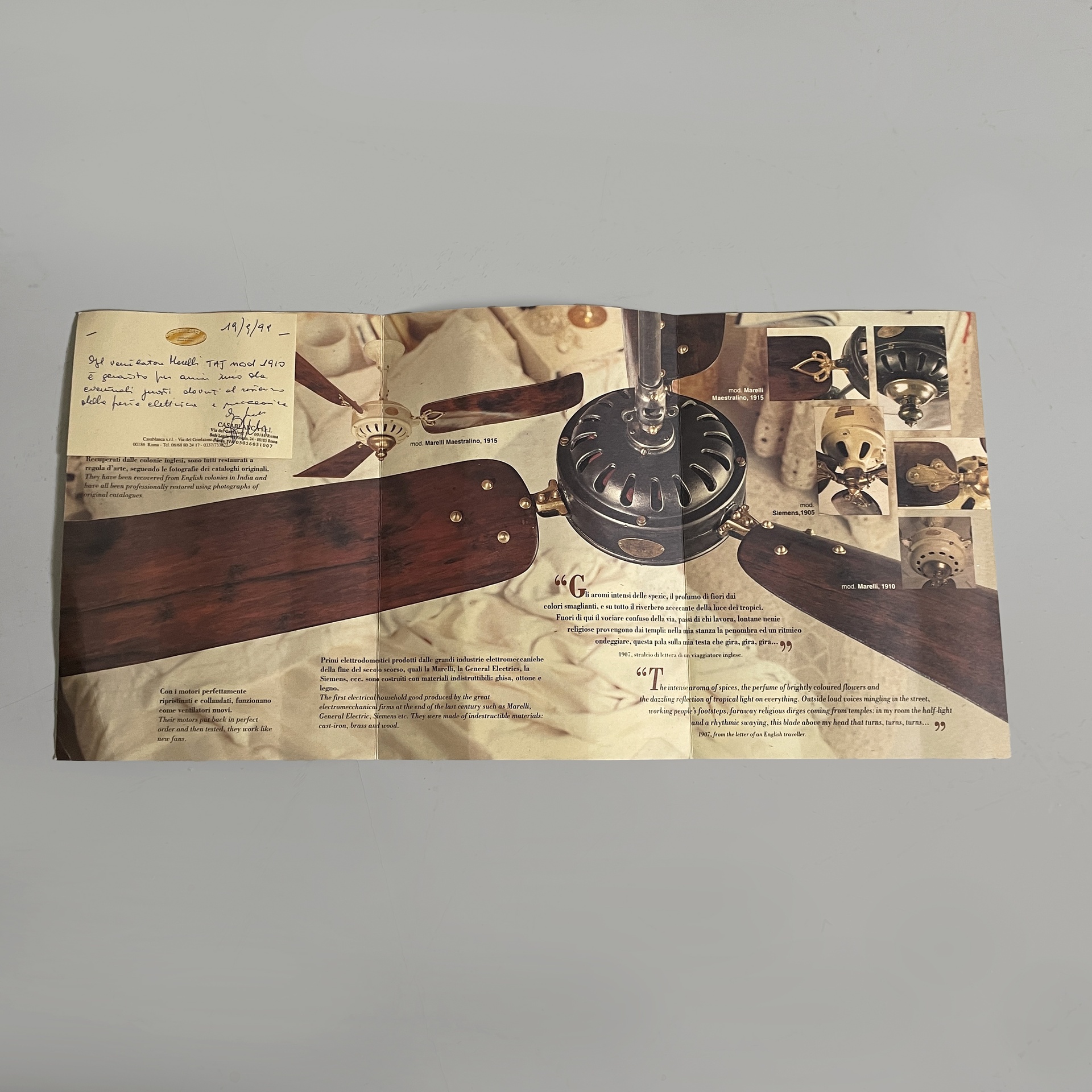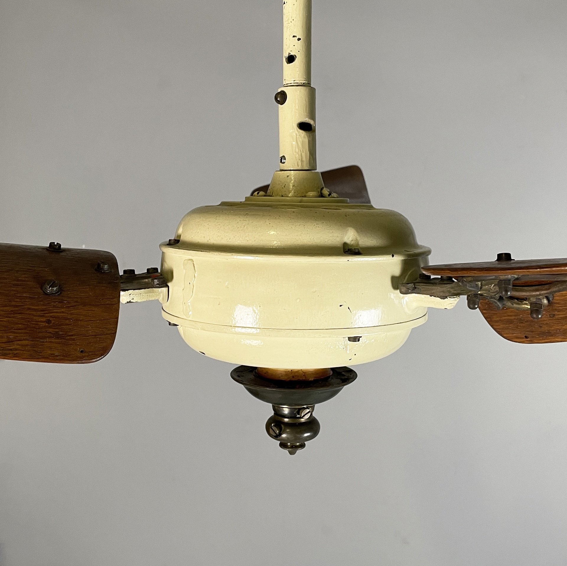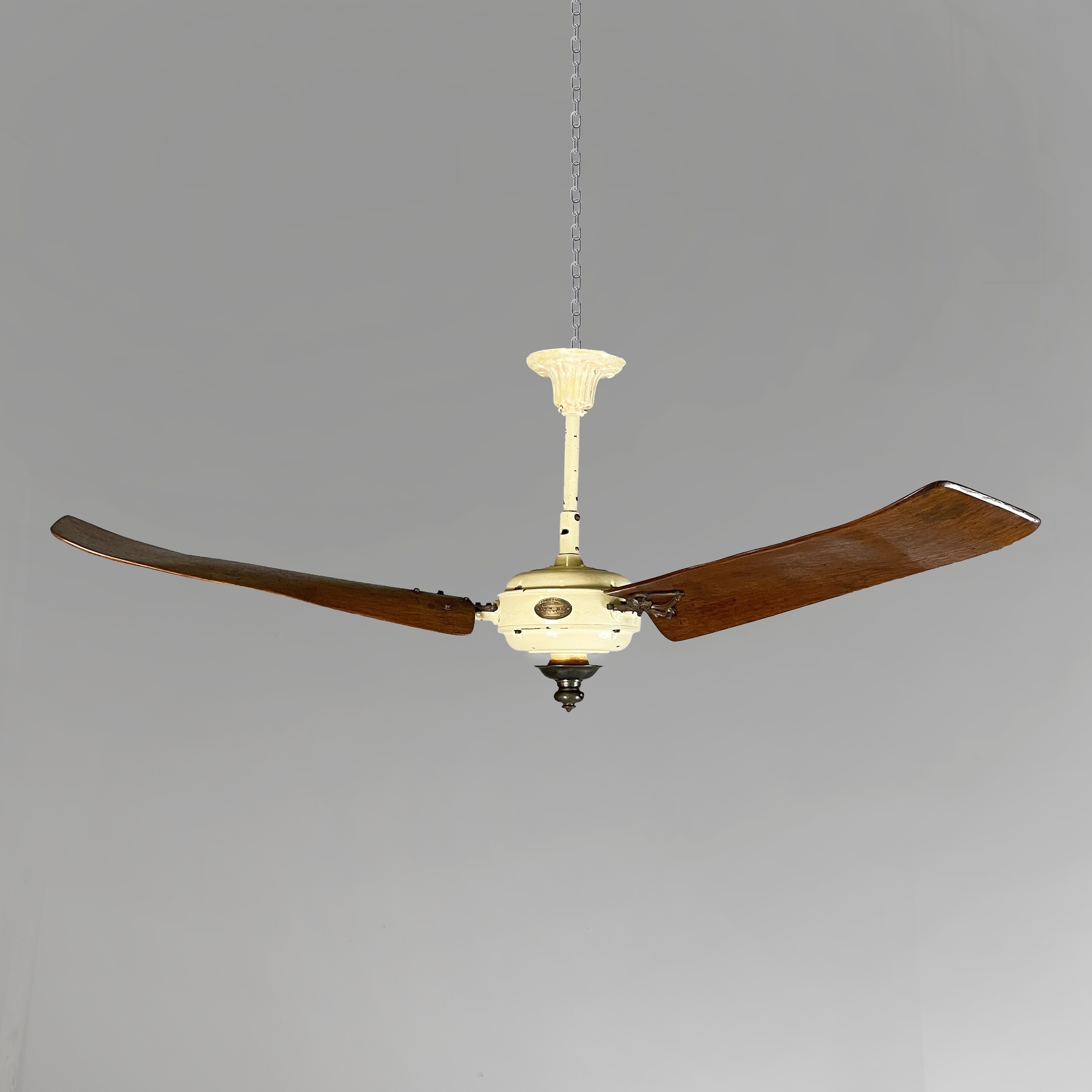 Ventilatore da soffitto modello Marelli con tre pale in legno curvato. La struttura centrale a sezione tonda è in metallo verniciato beige con dettagli in metallo. Attacco a soffitto decorato e stelo in metallo verniciato beige.