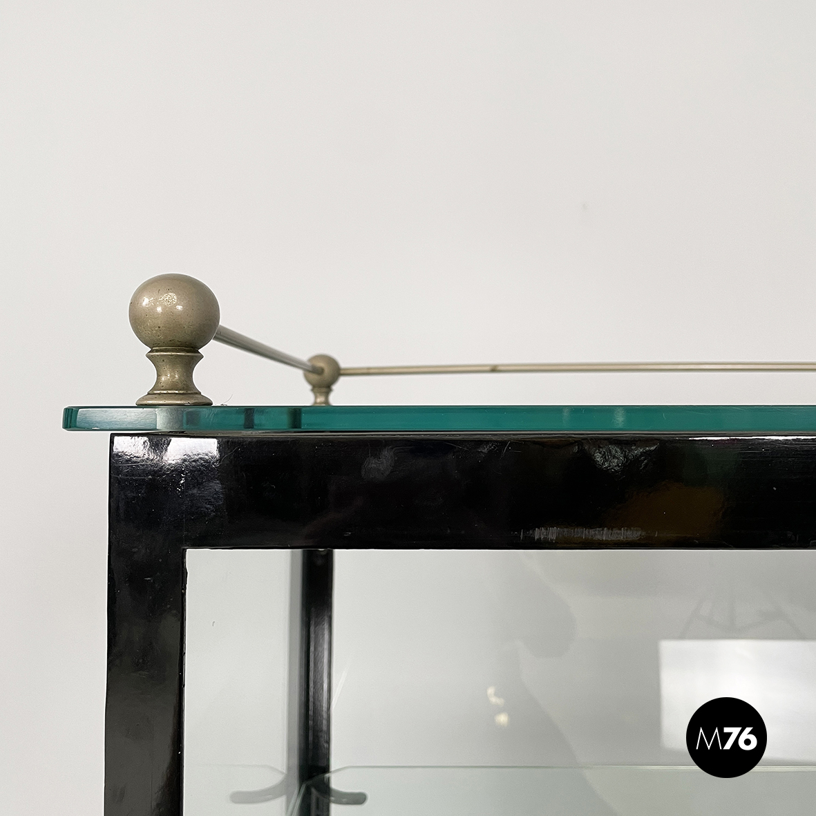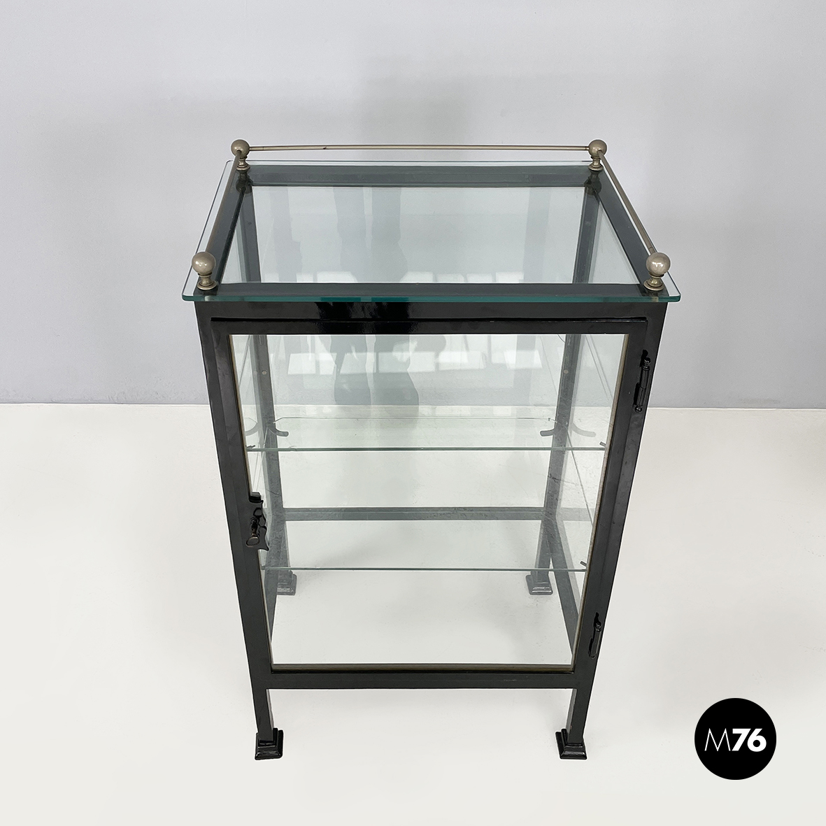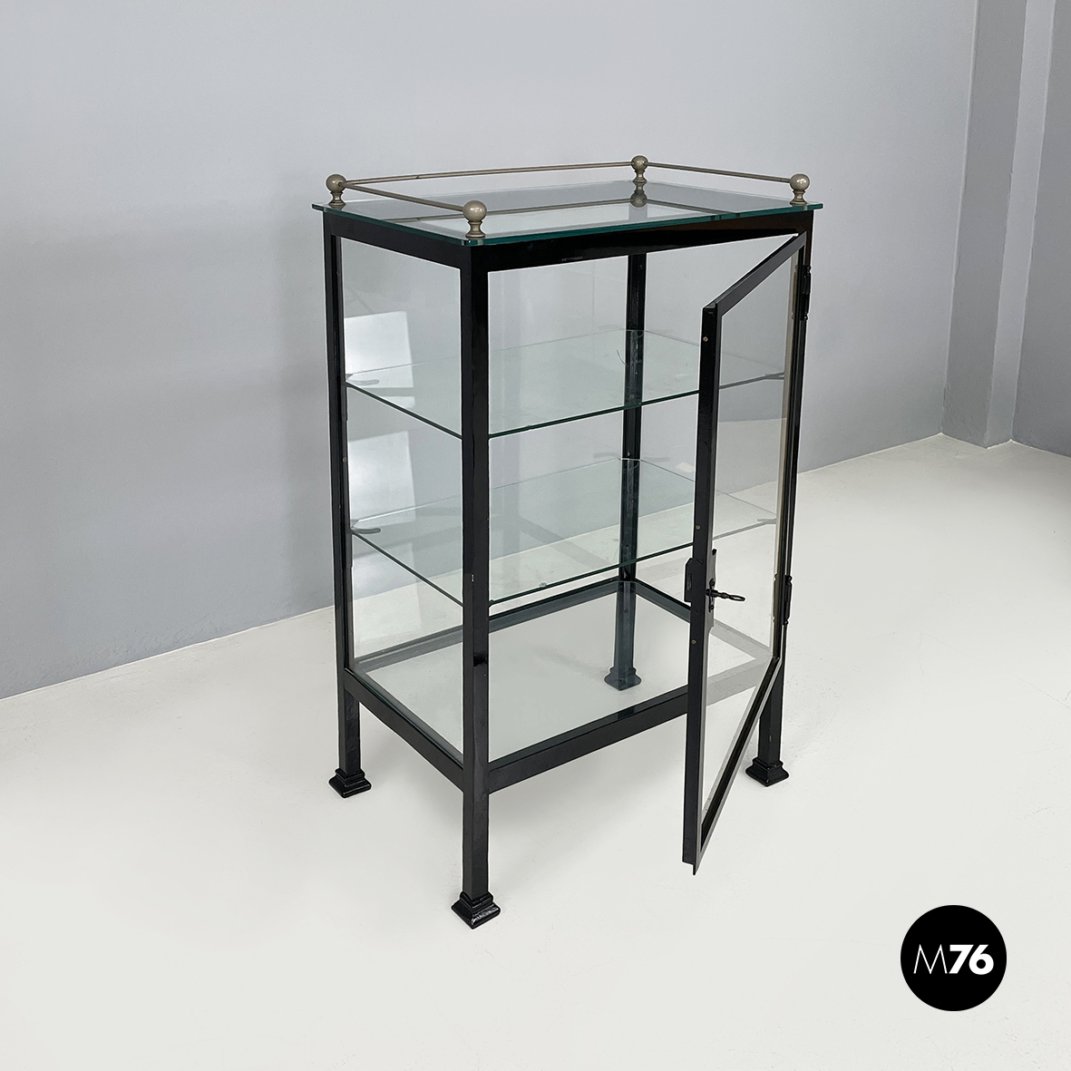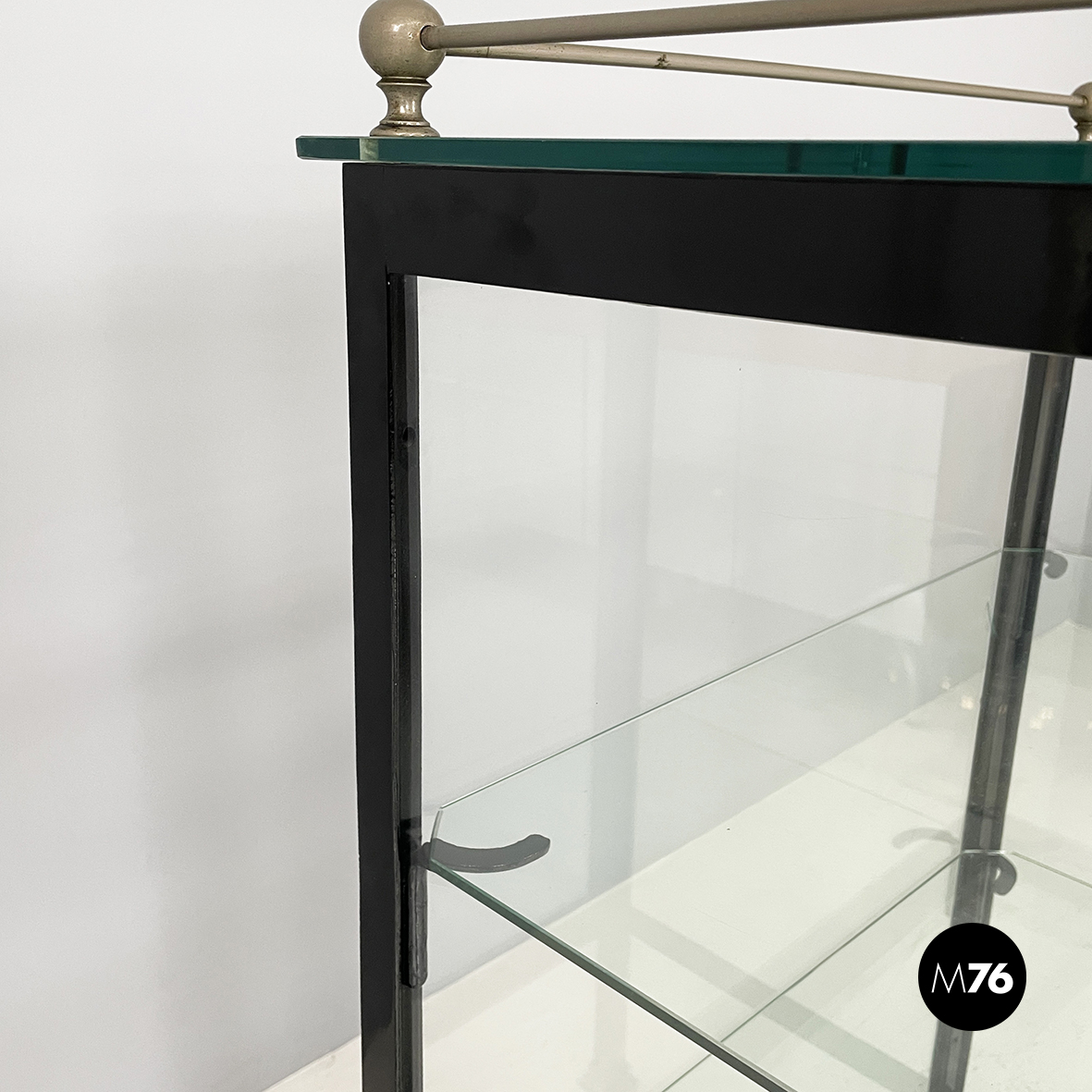 Vetrina espositiva a base rettangolare in metallo verniciato nero e vetro. Il telaio è in listelli di metallo verniciato nero, mentre i vari lati sono in vetro trasparente. Ai quattro angoli della parte superiore sono posizionate quattro sfere decorative in metallo, unite da un tondino di metallo. All’interno sono presenti due mensole in vetro spesso, poggiate su piccole parti metalliche nere. Sul fronte dell’espositore è presente una serratura con relativa chiave. Zampe a sezione quadrata, finemente lavorate, in metallo verniciato nero. Utilizzabile anche come piccolo armadio o credenza.
