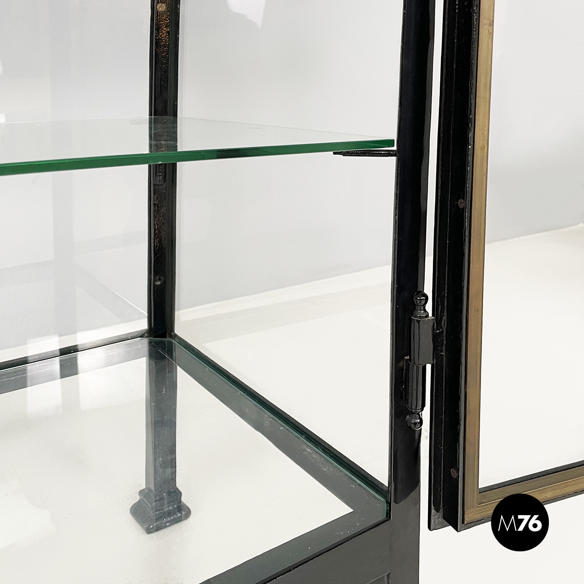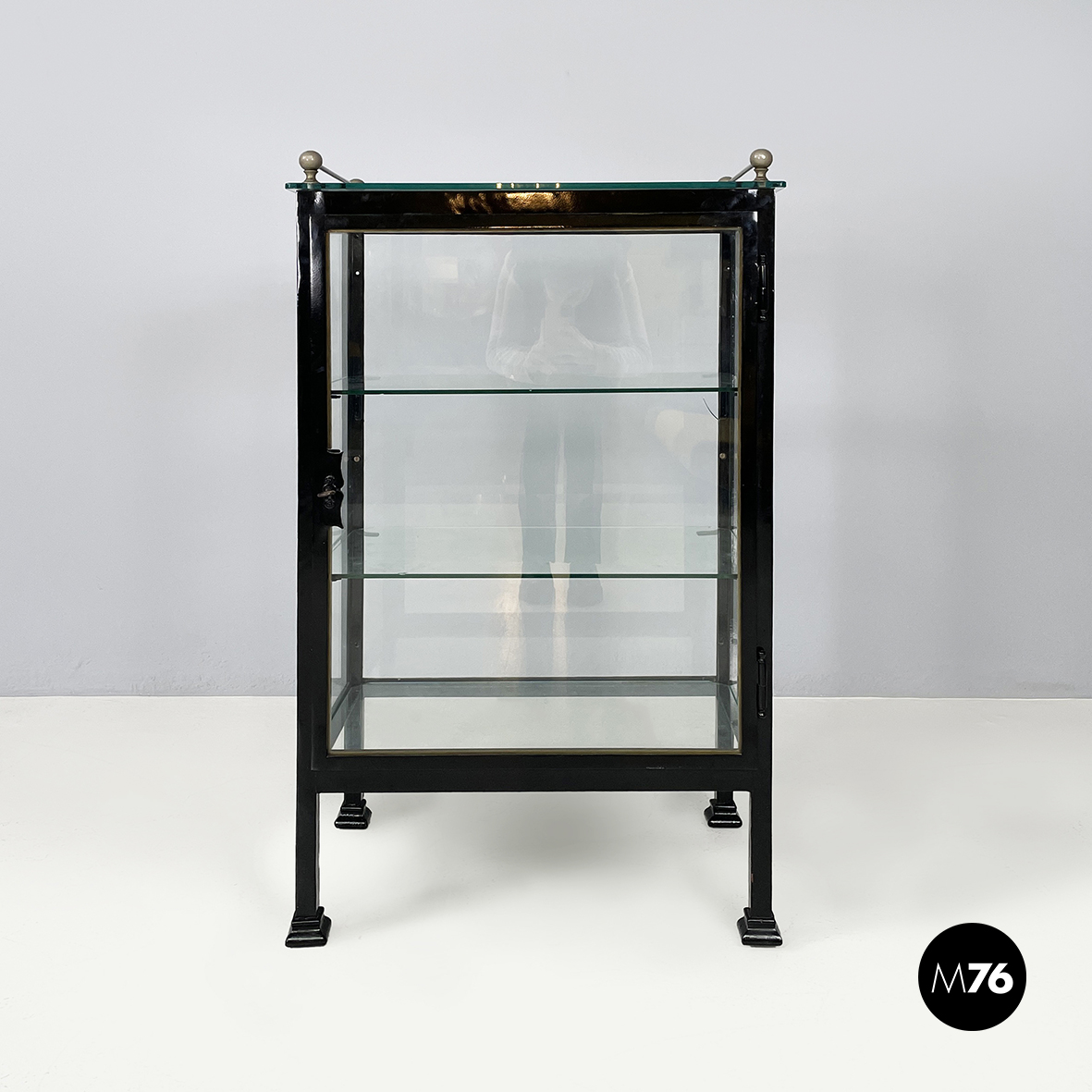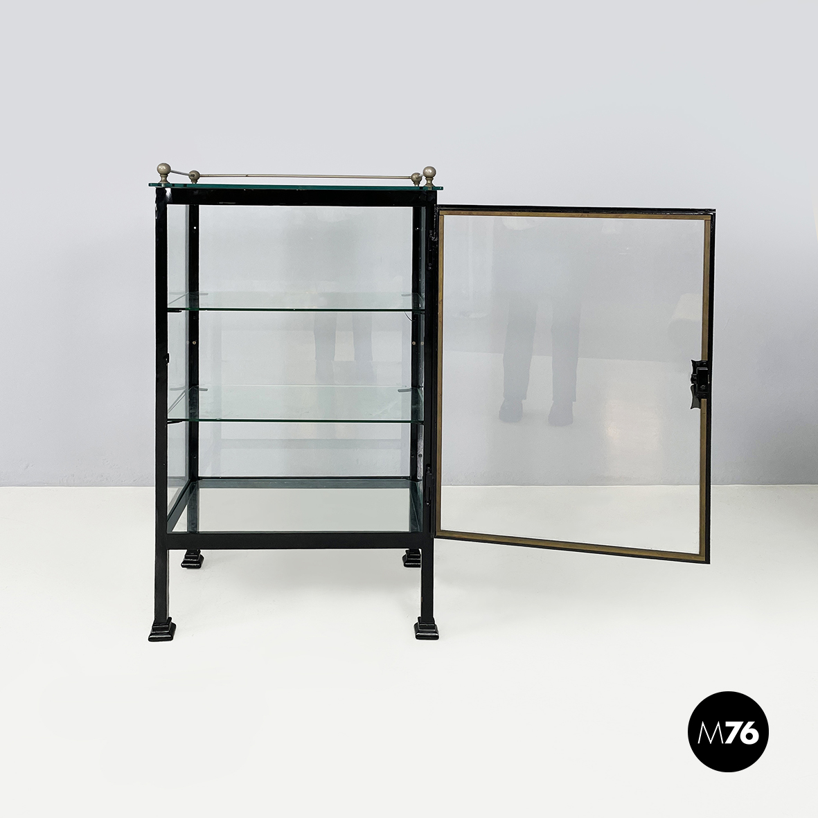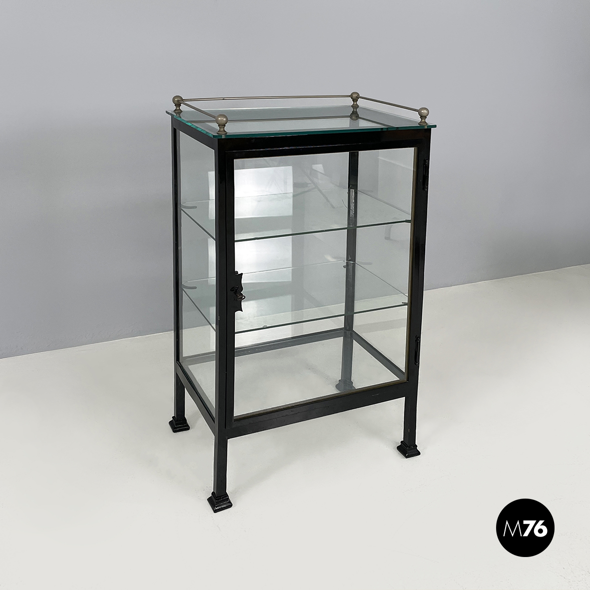 Vetrina espositiva a base rettangolare in metallo verniciato nero e vetro. Il telaio è in listelli di metallo verniciato nero, mentre i vari lati sono in vetro trasparente. Ai quattro angoli della parte superiore sono posizionate quattro sfere decorative in metallo, unite da un tondino di metallo. All’interno sono presenti due mensole in vetro spesso, poggiate su piccole parti metalliche nere. Sul fronte dell’espositore è presente una serratura con relativa chiave. Zampe a sezione quadrata, finemente lavorate, in metallo verniciato nero. Utilizzabile anche come piccolo armadio o credenza.
