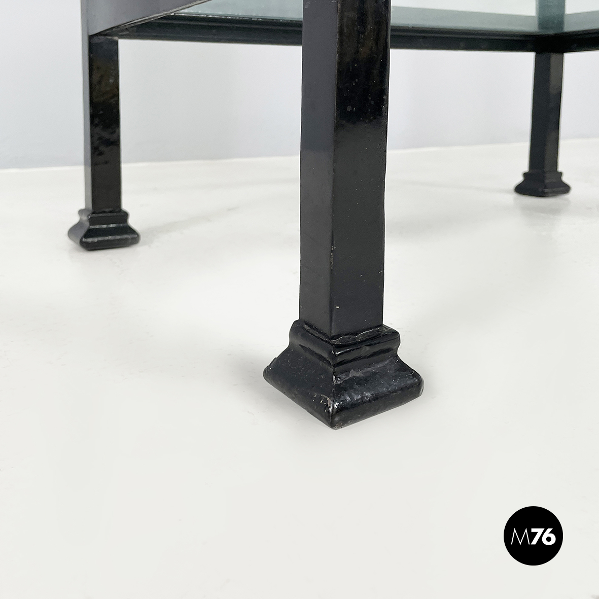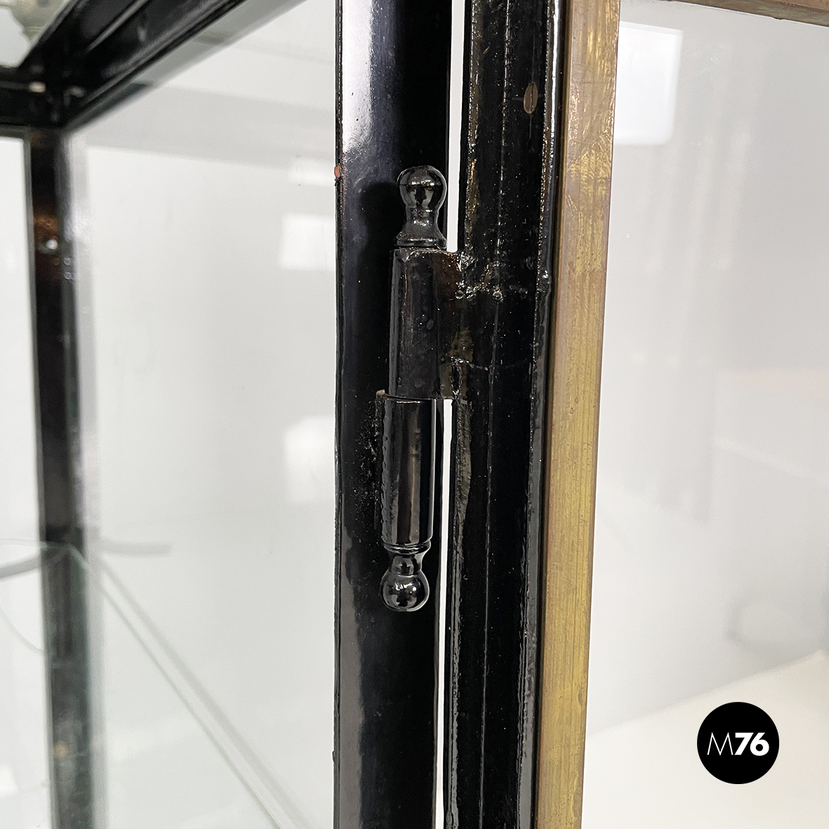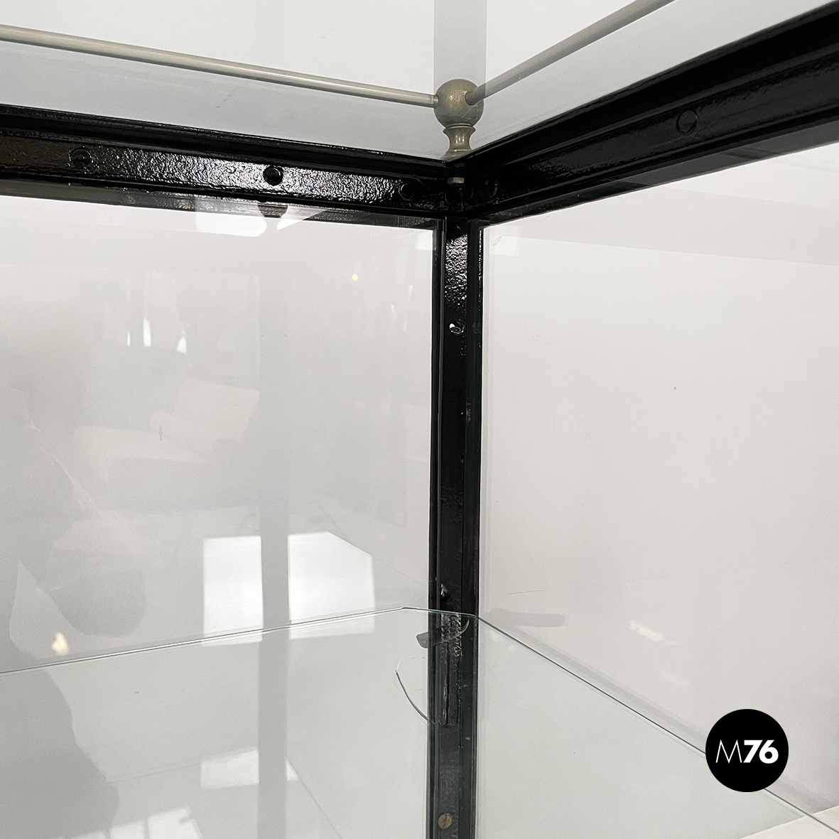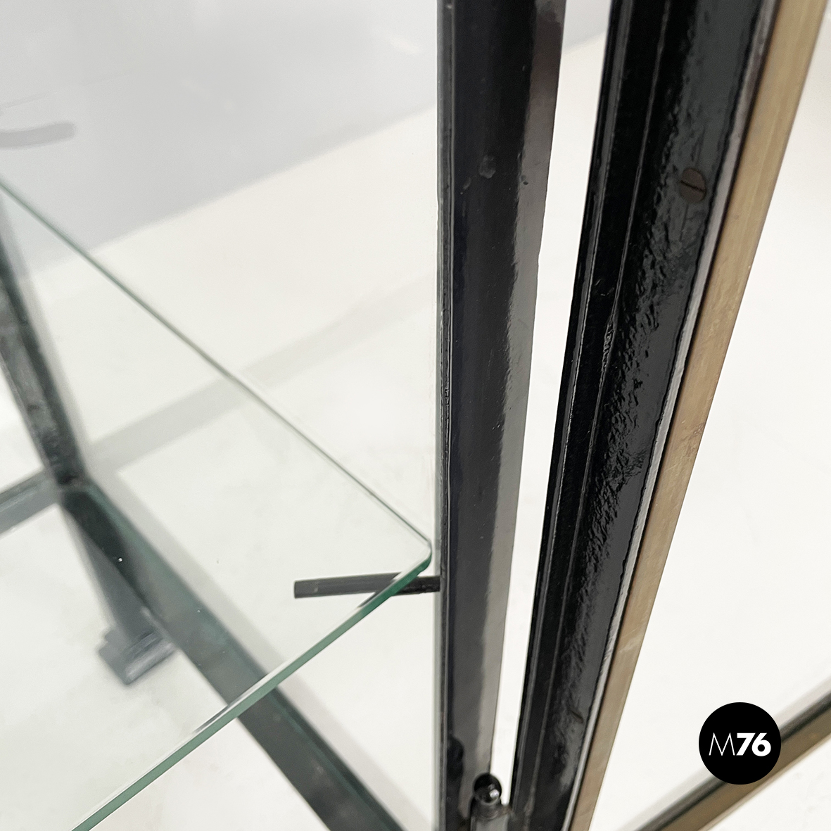Vetrina espositiva a base rettangolare in metallo verniciato nero e vetro. Il telaio è in listelli di metallo verniciato nero, mentre i vari lati sono in vetro trasparente. Ai quattro angoli della parte superiore sono posizionate quattro sfere decorative in metallo, unite da un tondino di metallo. All’interno sono presenti due mensole in vetro spesso, poggiate su piccole parti metalliche nere. Sul fronte dell’espositore è presente una serratura con relativa chiave. Zampe a sezione quadrata, finemente lavorate, in metallo verniciato nero. Utilizzabile anche come piccolo armadio o credenza.