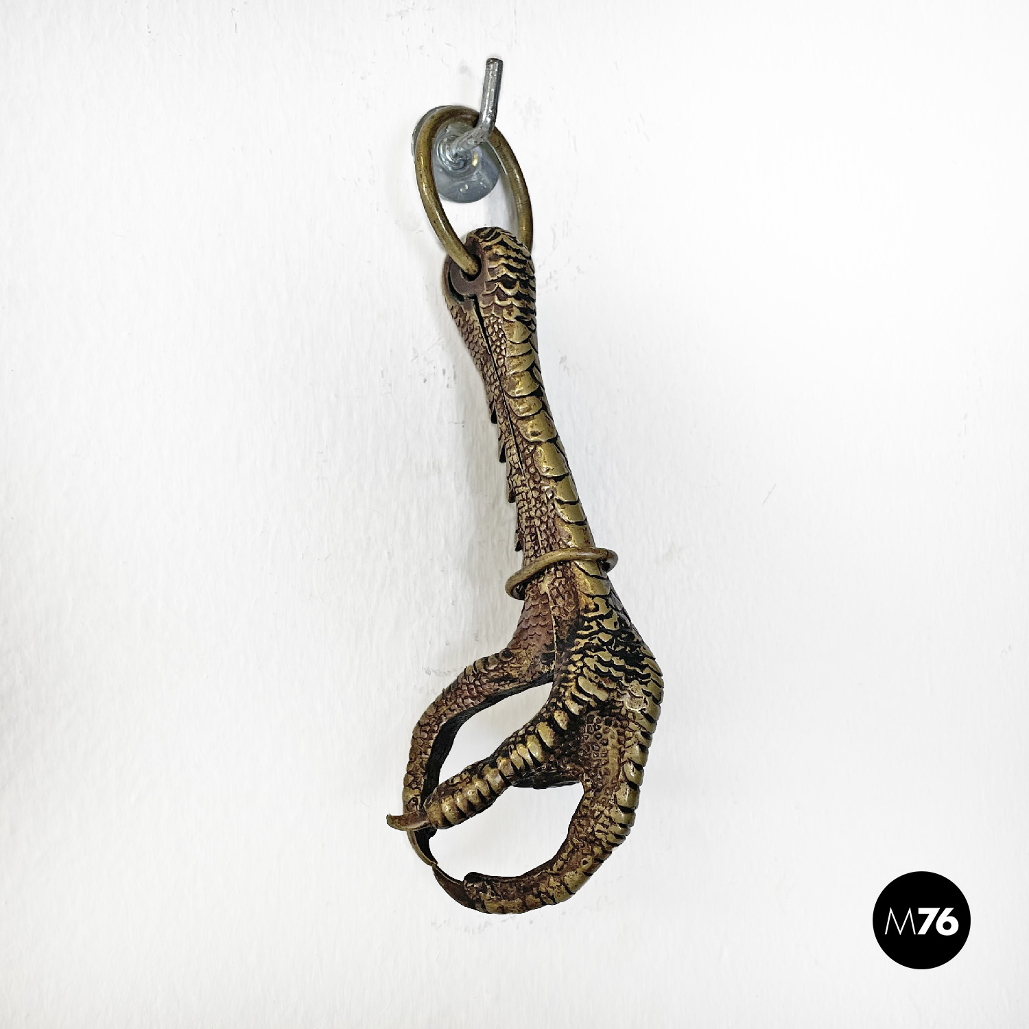 Zampa di fagiano porta selvaggina in bronzo. La struttura è composta da due parti ricordando la forma di una pinza, si possono allargare a piacimento e stringere utilizzando l’ellisse in bronzo. Si può appendere grazie al cerchio nella parte finale.